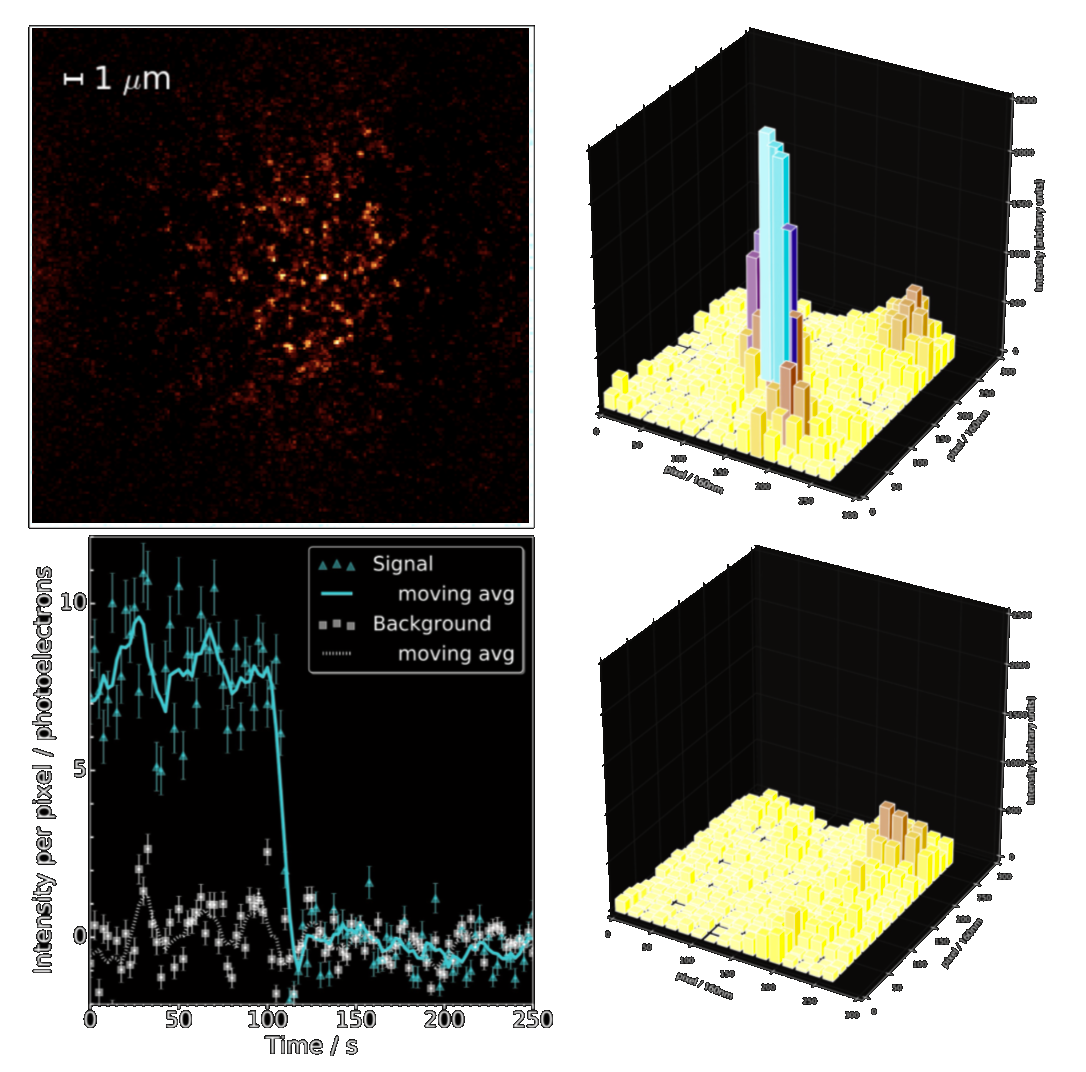 So how could something like this be achieved? Single molecule fluorescence imaging is a widely used technique in biochemistry, where it enables superresolution imaging to reconstruct features on spatial scales below the diffraction limit. A commonly imaged ion is Ca2+, which plays an important role in neuronal signaling in humans and animals. The NEXT collaboration demonstrated that molecules that were designed to image Ca2+ can also realize single molecule fluorescence imaging of Ba2+. Single molecules can be identified by observing the time dependence of the fluorescence emitted from individual spots in a microscope image โ a loss of fluorescence intensity indicates that a molecule has undergone a destructive chemical reaction and ceased emission. This loss of brightness occuring in a single step is the hallmark of single molecule fluorescence. The image below shows examples of single ions that were imaged by NEXT using commercial calcium sensing dyes, in Ref. 3.